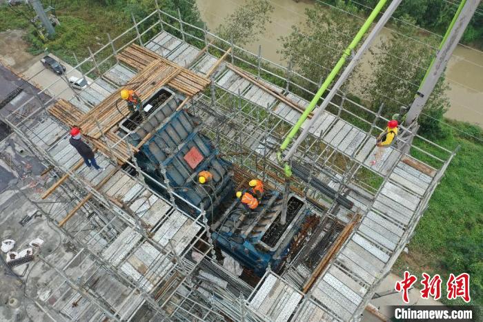 在引江濟淮工程江淮溝通段玉蘭大道橋主塔封頂施工現(xiàn)場,工作人員正在緊張而有序地施工。 韓翔 攝